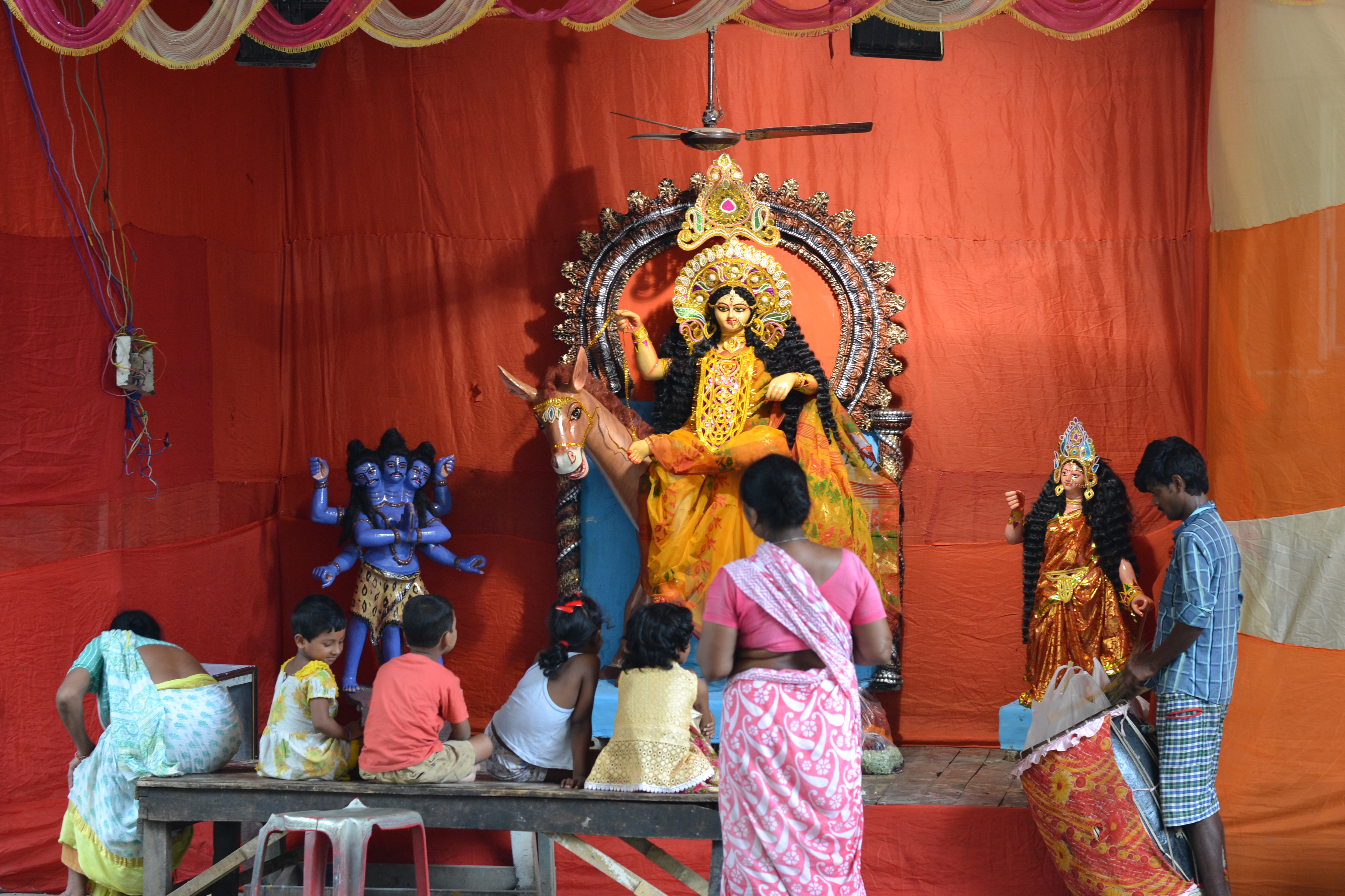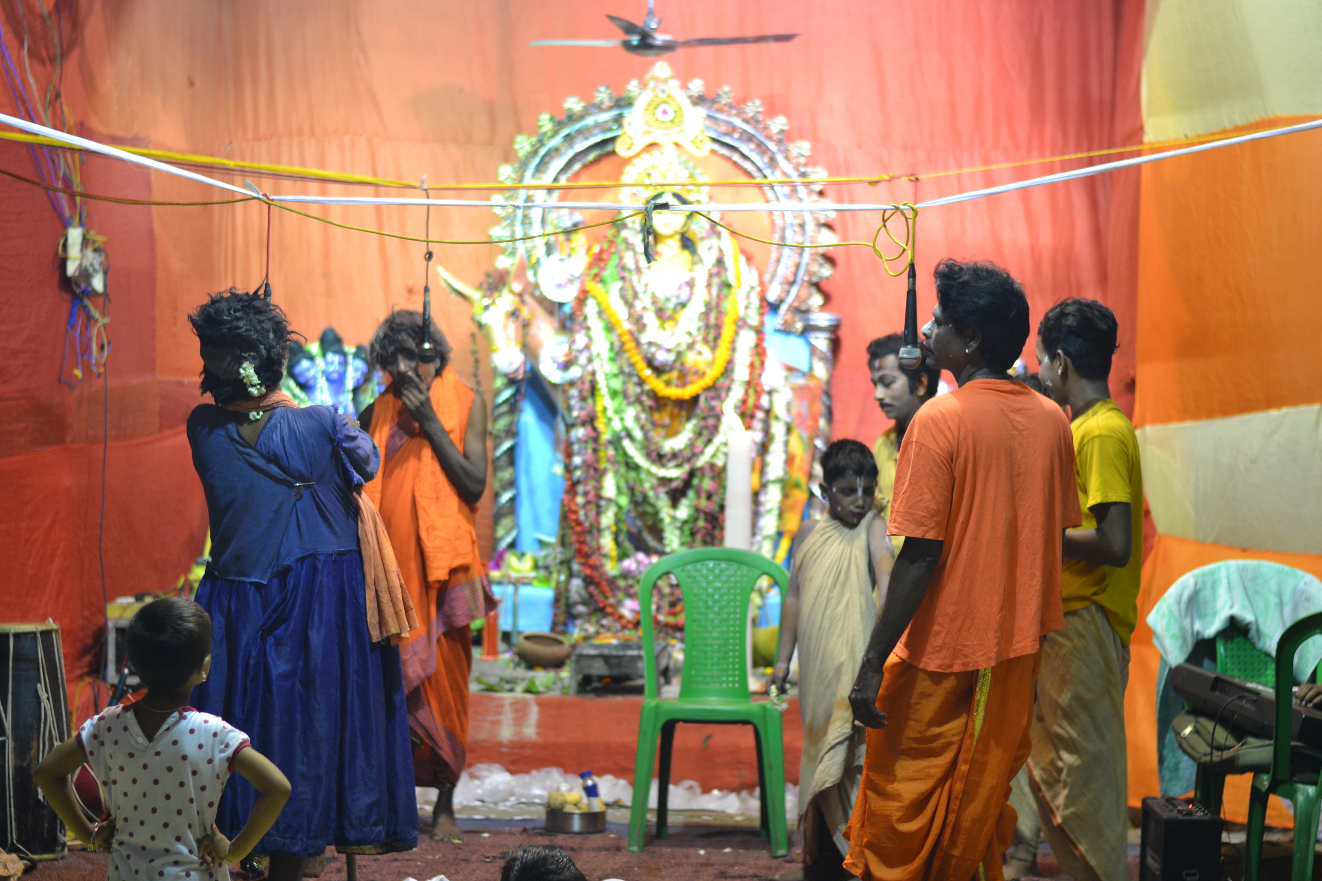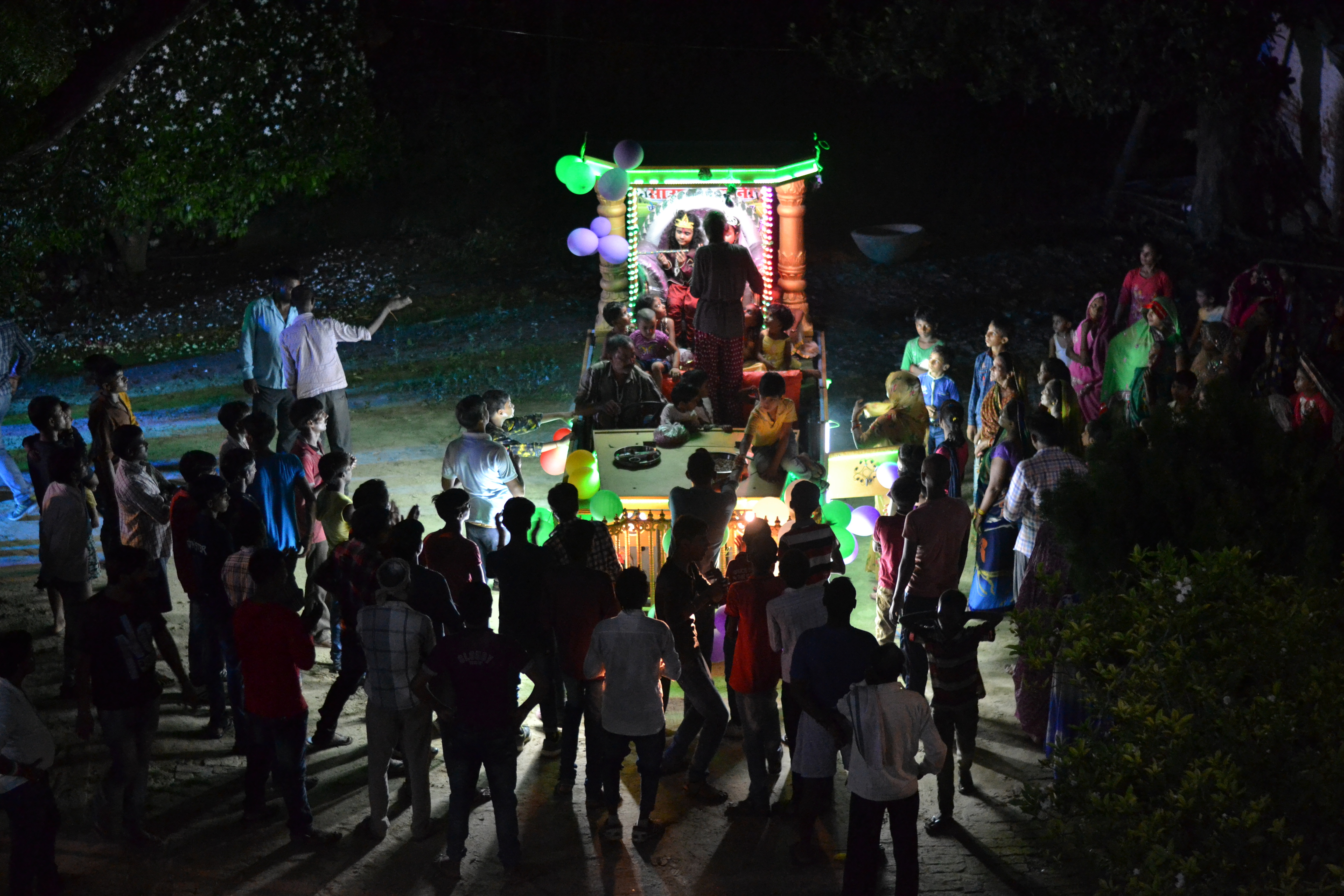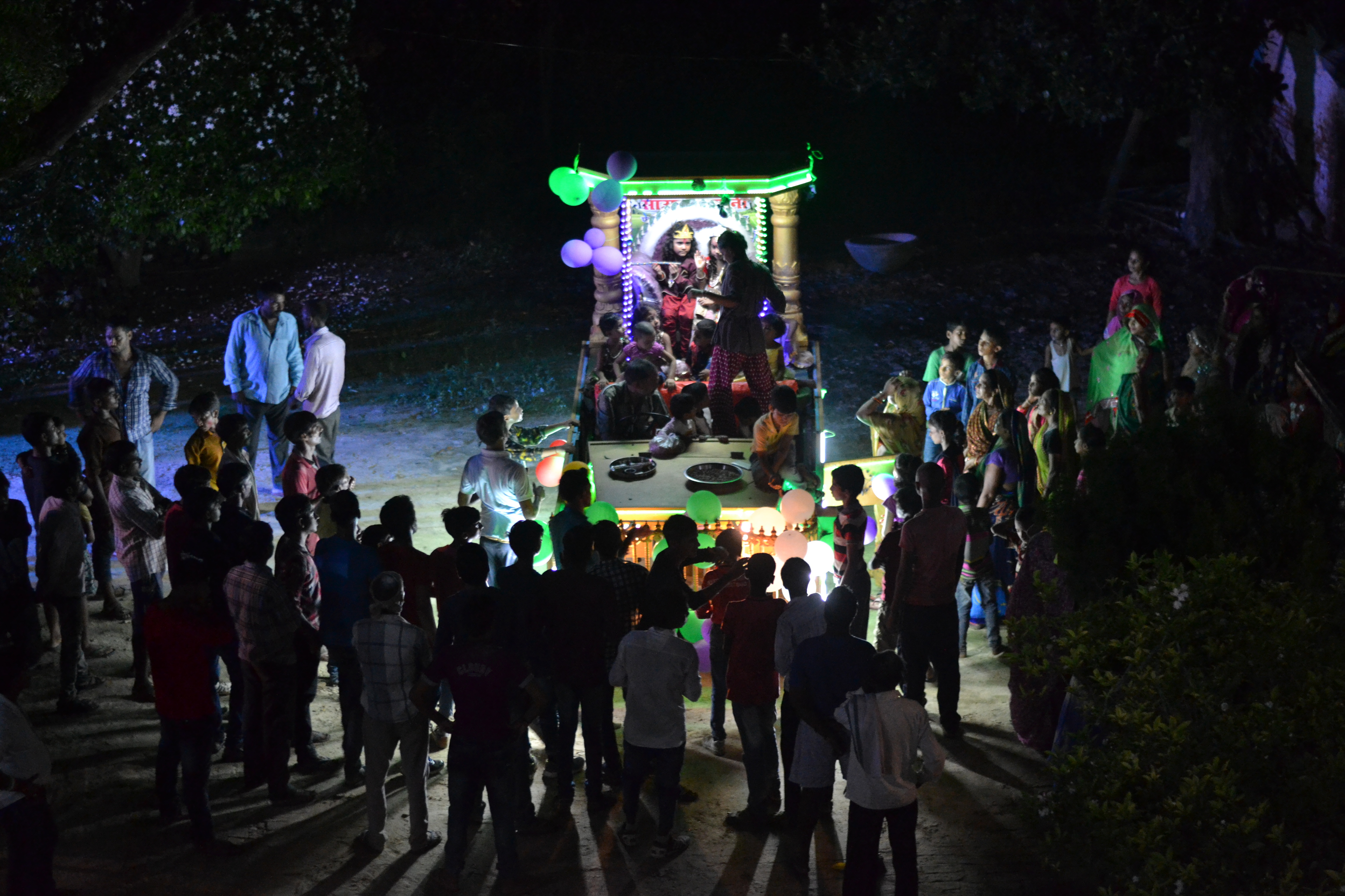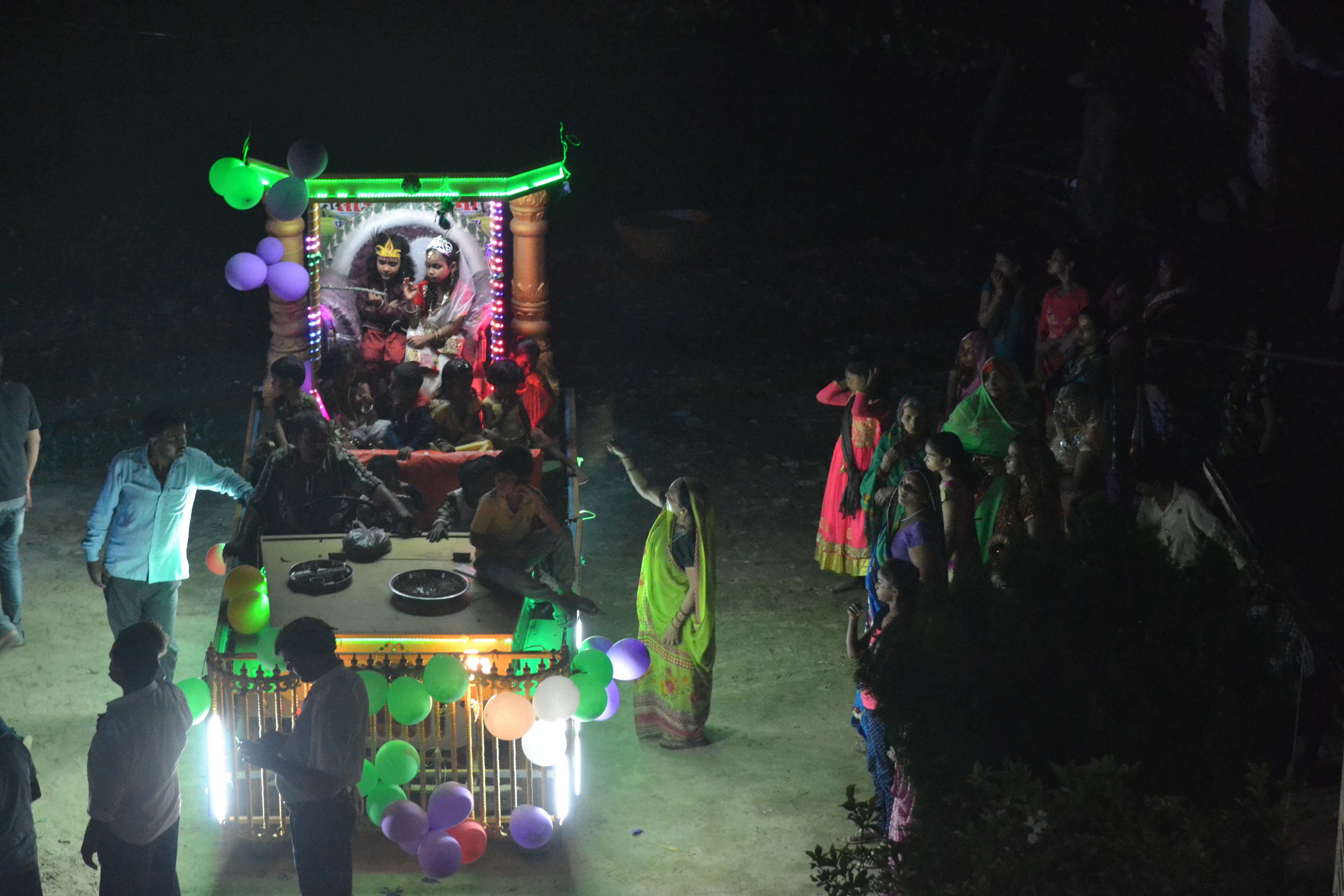 A Traveling float carrying young children playing Radha and Krishna visits Sangrampur Village on Krishna Janmashtmi, 2017